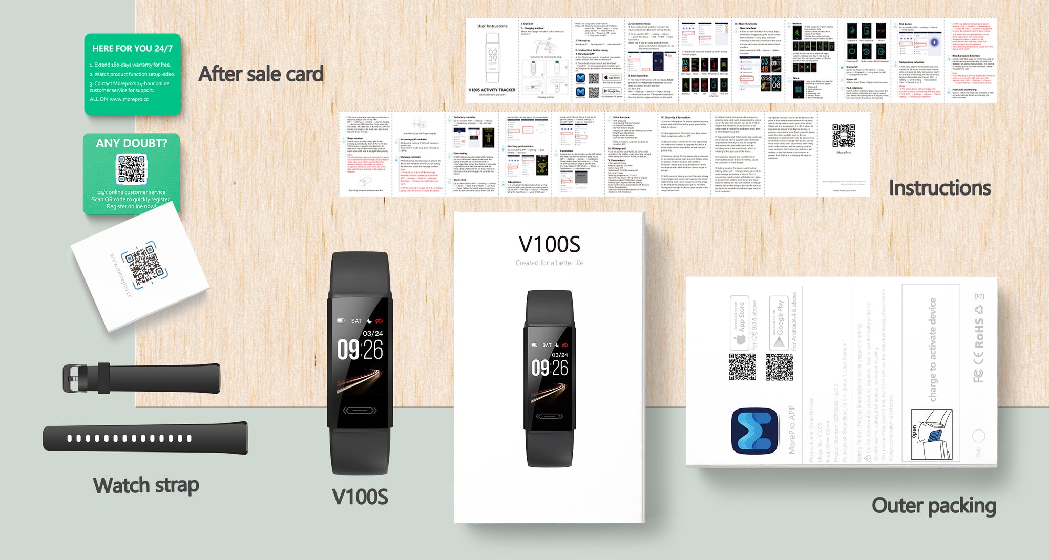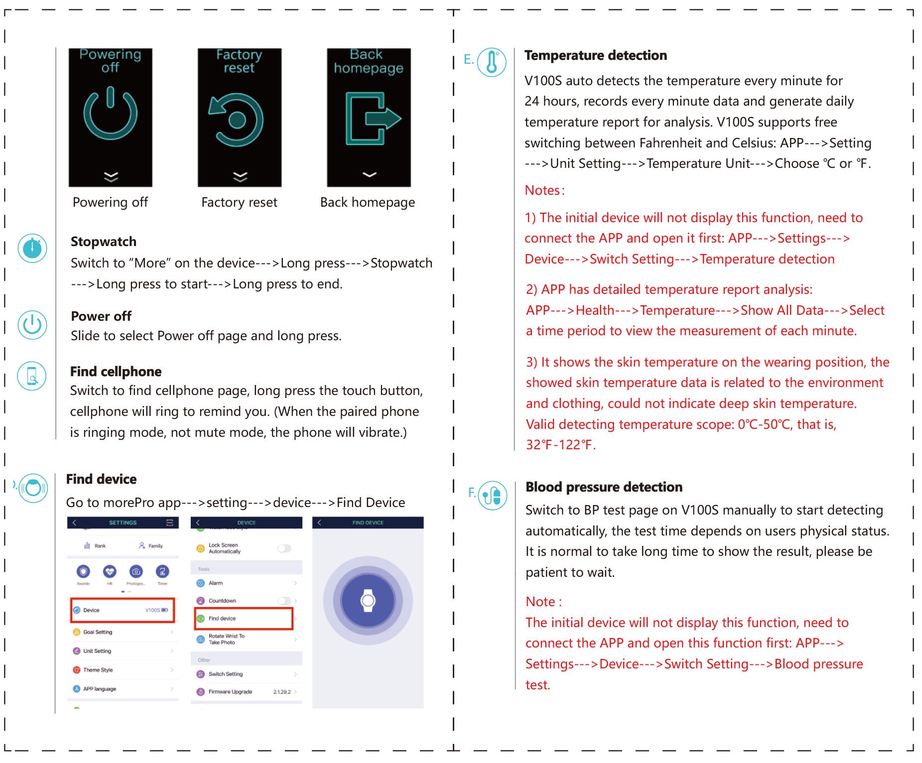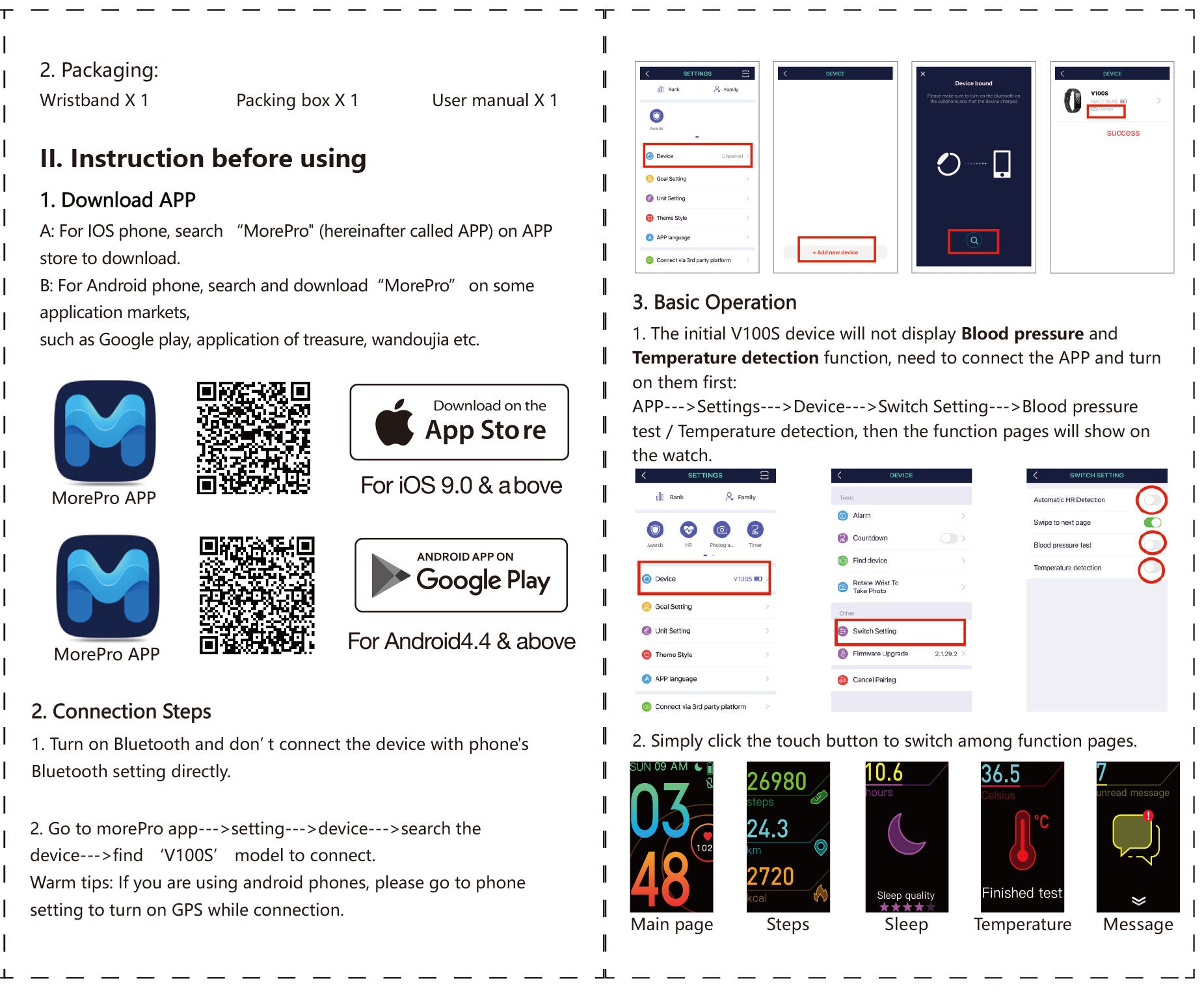 A:The device can’t pair to the phone’s Bluetooth directly. You can download the MorePro app on Google Play or App Store. Turn on the Bluetooth and the GPS/location while connection, go to MorePro app-->setting-->search the device-->find “V100S”model to connect.